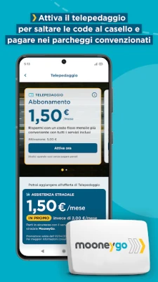 - Attiva il dispositivo di telepedaggio MooneyGo: potrai saltare le code al casello su tutte le autostrade italiane, pagare automaticamente Area C Milano, traghetti e oltre 380 parcheggi convenzionati, richiedere il servizio di Assistenza Stradale MooneyGo, attivo 24 ore su 24, direttamente dall’app.