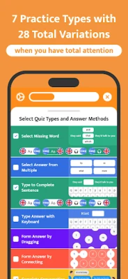 - Practice with your favorite interactive quiz types to master your vocabulary (there are a total of 7 practice types with 28 total variations regarding hint, answer type, and language)