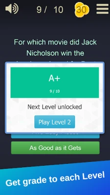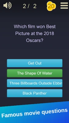 Playing is pretty simple: Trivia question will be asked with possible 4 options, You need to choose the correct one. Answer movie trivia questions and check your movie knowledge!