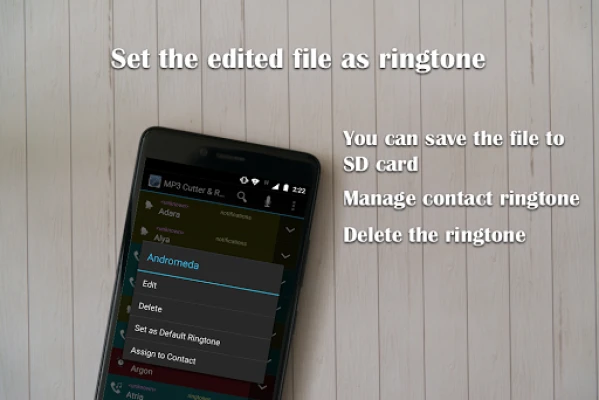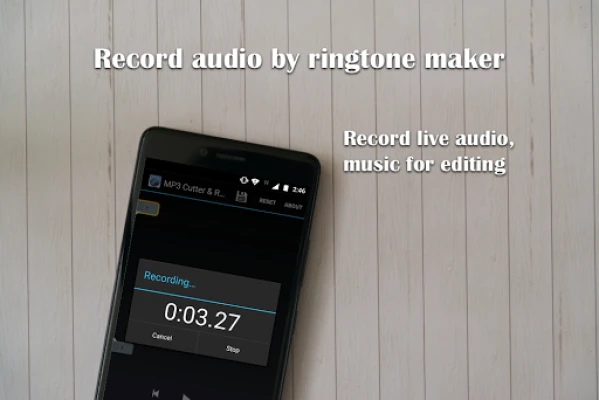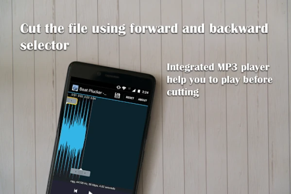 - List all the MP3 songs from the SD card . - Choose the MP3 files from the list . - Cut the file using forward and backward selector . - Integrated MP3 player help you to play before cutting . - You can save the file to SD card . - Set the edited file as ring tone .