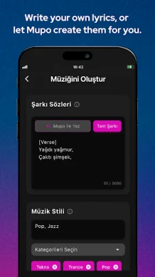 No lyrics? No problem. MUPO includes a powerful AI lyrics generator that helps you create meaningful verses, choruses, and song structures. Combine it with the AI song generator for complete music production.