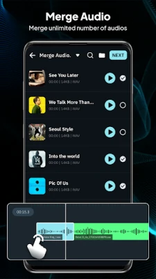 Bring your audio elements together seamlessly with our Merge Audio feature. Merge unlimited number of audios. Whether you're merging songs, creating a podcast, or blending sound effects, our intuitive tool ensures a smooth and effortless process. Just a few clicks, and you can craft a unified and captivating auditory experience