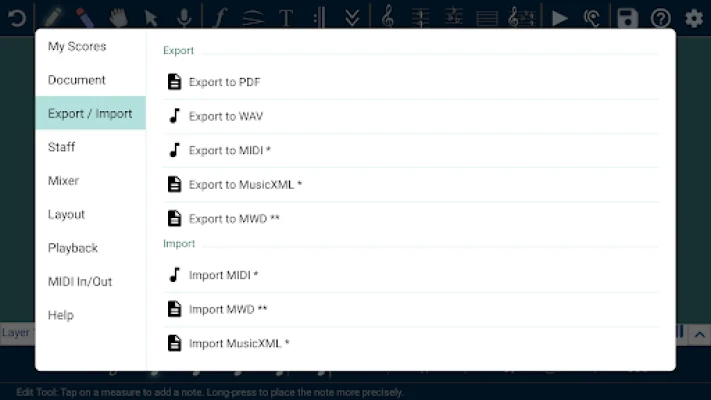 - Export the sheet music to PDF, MIDI, MusicXML or MWD
