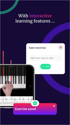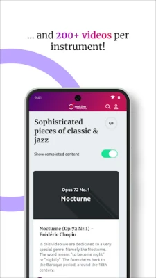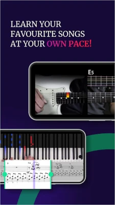 In our tutorials, you always have the keyboard or fingerboard in view, while at the same time the score line is displayed for you to play along with. The specially developed practice mode allows you to mark individual sections and repeat them as often as you like at your own pace.
