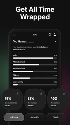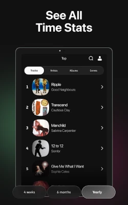 Do you want to see your music stats anytime? With MusicList you can instantly check your listening habits and discover insights about your favorite tracks, artists, albums, and playlists. Explore your top artists, songs, and genres.