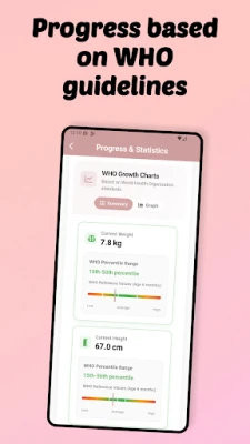 WHO-ALIGNED GROWTH INSIGHTS Turn everyday entries into clear, WHO-based growth percentiles and progress charts. Understand your baby's development at a glance with clean visualizations that make trends easy to follow.
