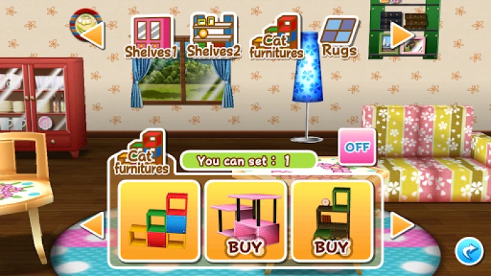 You can buy various furniture (such as chair, table, bed, etc.) with coins you got.
