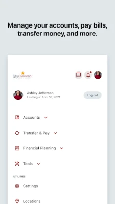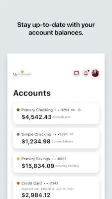 My Community Credit Union's free mobile application provides you instant access to your account directly from your phone. You get 24/7 access to view your balances, deposit checks, pay bills, and more!