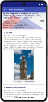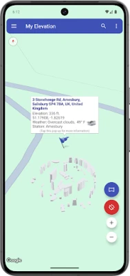 ● Long press a location on the map and My Elevation will tell you the weather there and let you browse Wikipedia articles about attractions nearby the location.