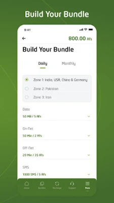 Build your bundle: customize your bundles and chose from daily and monthly data bundles, OnNet voice bundles, OffNet call bundles, SMS bundles, and international bundles.