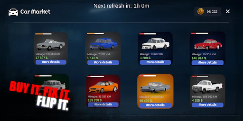 Buy used and junk cars, negotiate with shady sellers, repair them by hand, add custom tuning, and flip for big profit. Explore a massive open world inspired by rural America — with live traffic, gas stations, garages, and unpredictable weather. Whether you love fixing dents or chasing rare deals — this is your garage dream come true.