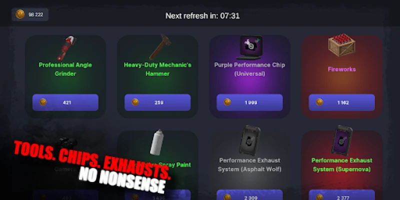 • Use tools, paint, tuning, and junkyard parts to restore cars.