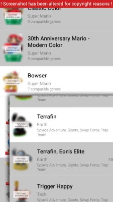 • Largest database available: games, hardware, amiibo (characters, cards), Skylanders (characters, cars, traps, items, adventures)