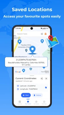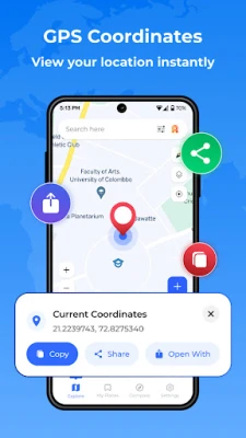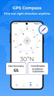Open the app, and your current location is displayed instantly with clear coordinates. Switch between maps, view your direction on the compass, and save locations.