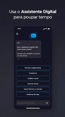 Usa o Assistente Digital para esclarecer as tuas dúvidas, aceder rapidamente às funcionalidades da app ou resolver avarias de forma automática. E se não resolveres a avaria, encaminha-te para um assistente humano.