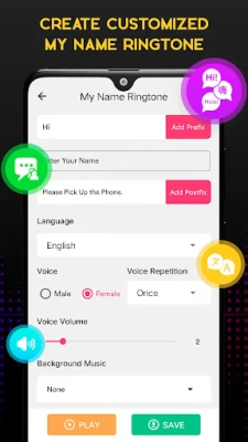 Now, no need to browse online websites to create ringtones, you can use this My Name Ringtone creator to create ultimate and innovative customized tones. Make ringtones with your text or you may choose from default text. You can select the prefix and postfix as of your choices. After selecting this expression you can play it for listen, so you can decide to fix it or change it. For example, you can create "Dear, Call for you", “Please pick the call”, “Buddy is calling” and many more.