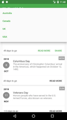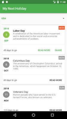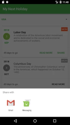Use this app to find the upcoming holidays/long weekends and start planning now. Create events on Calendar, read more details about the holidays and share them with anyone!