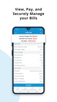 Manage bills and pay them securely, with multiple payment options available. View your bill and track payment history. Add a guest account to assist family members. • Receive Notices and Alerts Sign up for text or email notifications about your bill, payments and account changes. • Improve Water Use Efficiency View your monthly water use and get notified of money-saving, water conservation tips.