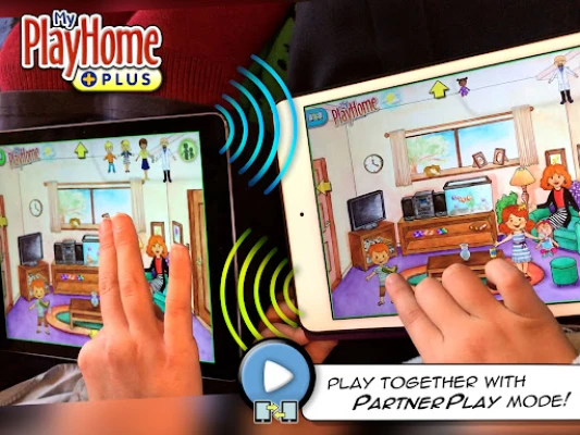 Now two people can connect their devices and play together in the same world! You just need to be connected to the same home WiFi and the PartnerPlay button should appear on the title screen when it detects another device playing My PlayHome Plus.