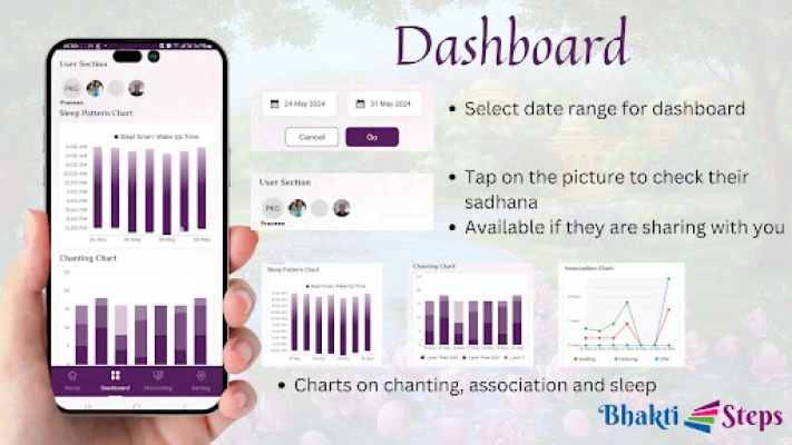 🔹 Dashboard View - See charts on chanting, association, and sleep over a selected date range.