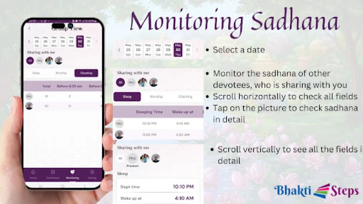 🔹 Mentor & Devotee Monitoring - Track sādhanā progress of devotees who share with you. Tap on their photo to see details.