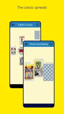 Three classic spreads are included but the app is first of all meant to simulate a physical deck and can be used in any way you want.