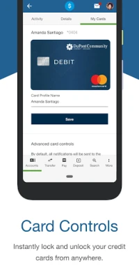 With the DuPont Community Credit Union Mobile App, you can: • Check balances • View transaction details • Make transfers • Apply for loans • Pay bills • Access debit or credit card controls • Pay loans • Make mobile deposits • Set travel alerts • Locate branch or ATM