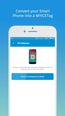 ## Turn your smart phone into a ICE Tag. The app embeds your emergency information into a custom QR code image for your phone's lock screen wallpaper. The QR code can be scanned by first responders to view your online profile.