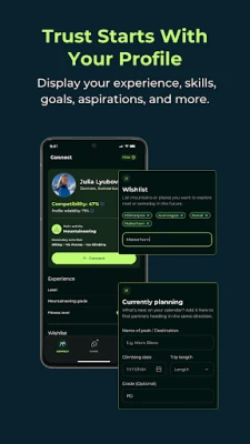 Send connection requests, chat, and start planning your next climb or trip directly in the app. Build trust before you even rope up.