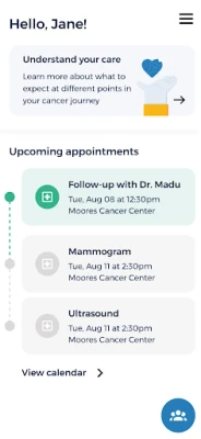 1. Connect with our Patient Navigators and other support services 2. Take personal notes about your appointments 3. Receive up to date directions, transit and parking information 4. Easily find numbers to contact your UC San Diego Health Care Team and Clinics 5. Review education materials on general cancer care 6. Access recommended cancer resources