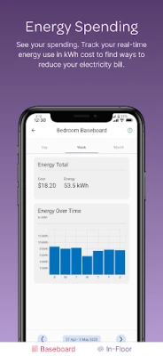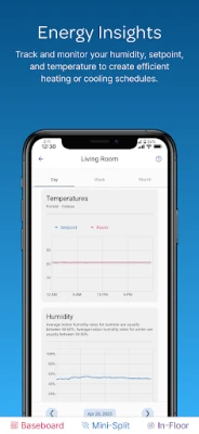 Energy Insights (Baseboard, In-Floor, AC): Track and monitor your humidity, setpoint, and temperature to create efficient heating or cooling schedules.