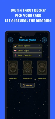 - Manual Tarot Spread: Already have your own deck? Perform your spread manually, pick your cards, and let our AI provide deep, insightful interpretations tailored just for you.