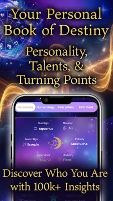 1. Your Personalized "Book of Destiny": Deep Self-Discovery Created from your birth date, time, and location, this is your unique "Book of Destiny." We weave together your Astrology chart, Four Pillars matrix, and Numerology figures to provide over 100,000 analytical patterns. Discover your true personality, hidden talents, love compatibility, career path, and life's major turning points. Use this deep divination tool to understand yourself and shine brighter.