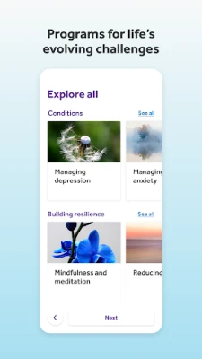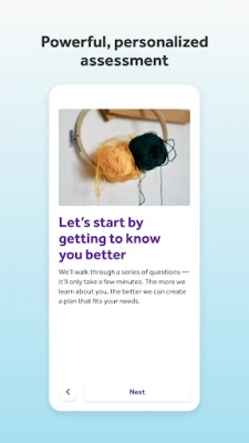 • Personalized plan to start getting support, customized to your preferences • Connect with a licensed therapist 7 days a week from the comfort of home • Recommended activities and content based on your ongoing needs • 24/7 access online or via our mobile app