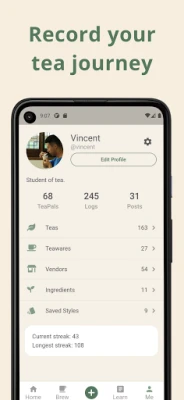 • ORGANIZE: Organize all your teas, teawares, vendors, ingredients, and brew logs in just one place
