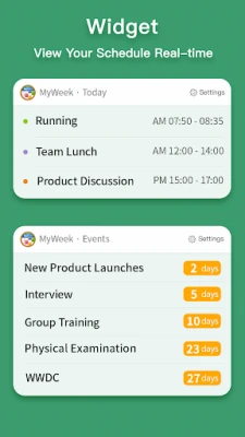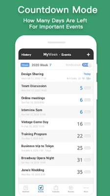 = Special Features = 1. Weekly Plan: Simple and intuitive bi-weekly view 2. Event Reminder: Meeting with customers? Buying a birthday present? Credit card? Countdown memos at a glance 3. Powerful Notifications: Daily reminders, reminders for each event 4. Multiple Plans: Vacation arrangement? Girlfriend schedule? 5. Desktop Widget: Easy access to recent events 6. Password protection: Protects your privacy