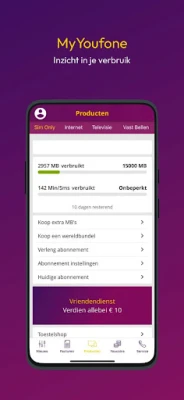 - Koop extra bundels voor Nederland en de EU of upgrade jouw abonnement - Koop extra TV pakketten of wijzig de kanalen die je volgende maand wilt zien - Check en wijzig jouw persoonlijke gegevens, abonnementsgegevens, instellingen en meer. - Inzicht in de facturen - Spaar Youcoins voor extra korting op je factuur