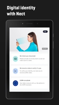Identify yourself quickly and securely or sign confidential documents - at any time and from anywhere. Without a personal appointment or extensive correspondence, without a PIN or video chat with a service agent. In the Nect Wallet, you can store your digital identity securely and have it at your disposal at all times. Whether it's your ID card, passport, driving licence or other ID documents. Use our user-friendly, fully automated solution to identify yourself at our partner companies in a legally compliant manner. Our Nect Wallet meets the highest security standards and is available without waiting time.