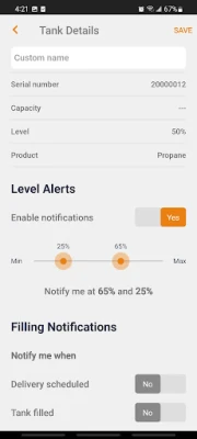 1. Accurately track the level of your tank in real-time from anywhere. 2. Consult your usage for the past 3 months in the blink of an eye. 3. Receive instant notifications on your smartphone when your tank reaches configurable and pre-determined levels. 4. With just one tap, contact your fuel supplier to request service or a refill. 5. Monitor and manage multiple tanks from one account. 6. Share access to data with up to 3 users.