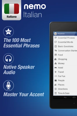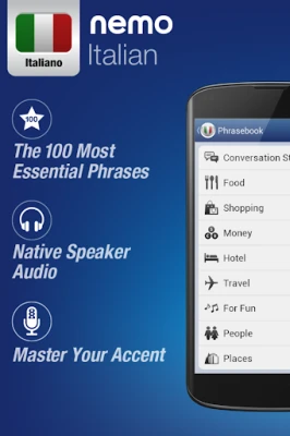 Nemo is designed to start you speaking the most useful words in Italian immediately and confidently. With millions of downloads from around the world, Nemo is now available for Android phones and tablets.