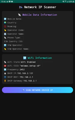 This app helps you quickly scan devices connected to your current Wi-Fi network. It also displays mobile network and Wi-Fi connection details in a clear and modern interface.