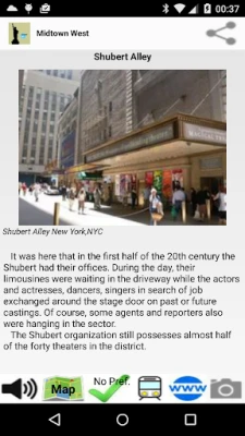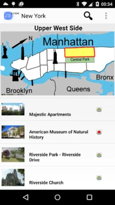 Guide of the city of New York, with an included self-oriented online or optional offline map and other tourist maps like WTC Memorial, Rockfeller Center, Columbia, Lincoln Center... The guide uses GPS location and compass to orient the map correctly. It offers 18 itineraries, describe 260 sights, and some practical aspects. It's a real tour guide to visit the city by yourself, with a focus on US history. You find many features, as exclusive maps or highlights for practical POIs (see screenshots). Texts are written only for this guide, with an historical perspective. There is no ads.