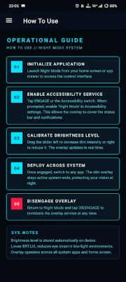To provide a consistent Night Mode experience across all screens — including system UI, notifications, and other apps — this app may request Accessibility Service permission.