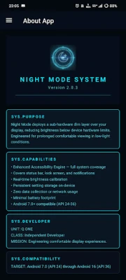 Night Mode is designed to reduce eye strain and improve screen comfort by applying a smooth dimming overlay across your device.