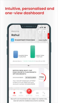 In today's digital era, consumers prioritize experiences before mutual fund investments. Our new app offers a top-notch, user-friendly interface, and cutting-edge features for an enhanced digital experience. With contemporary design, quick product discovery, and personalized recommendations, it's your ultimate solution for managing investments with Nippon India Mutual Fund.