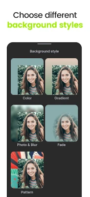 - Select the style of filling background. Choose between: color fill, gradient fill, fade, blur photo or stylish pattern.