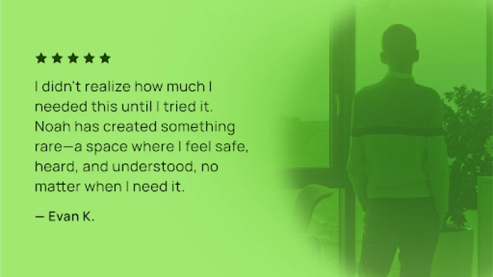 I’m Noah, your AI Therapist, here to help you feel calmer, better, and more supported every day. Whether you’re dealing with stress, anxiety, or simply craving a safe space to talk and chat about your mental health, I’m ready to guide you toward greater mental wellness. My approach combines self-care tips with personalized check-ins, so we can work together to uncover simple ways for you to feel calm and in control.