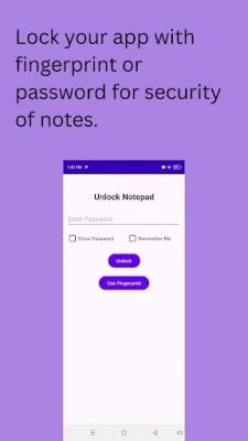 Security and Authentication: Lock the app or individual notes with passwords, security questions, or fingerprint biometrics. Remember Me option bypasses authentication for 24 hours.