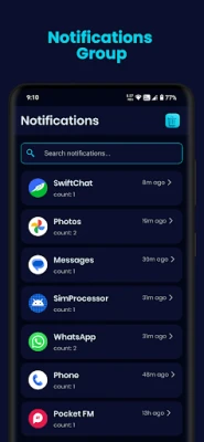 Easily search or filter notifications by app or time. Sort notifications by latest, oldest, or app name so you can quickly find the alert you need. The search is optimized for speed and returns results across your full history.