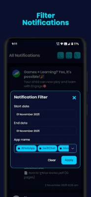 Export your full notification history or share selected logs with others in one tap. Export formats include CSV or PDF (CSV ideal for spreadsheets and analysis; PDF for sharing readable logs). Sharing works with email, cloud drives, or messaging apps — you control where your exports go.